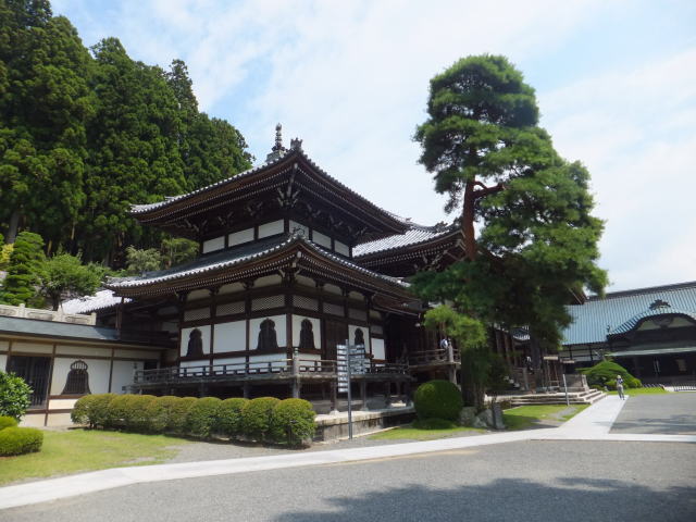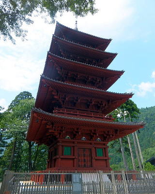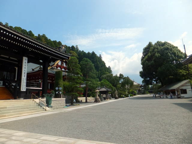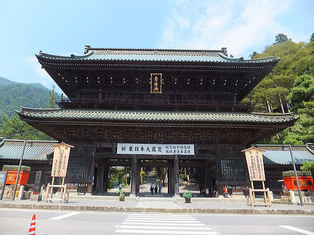 今回は身延駅から身延山(バス停)までバスで移動しましたので、バスに乗車したまま総門をくぐりました。 身延山のバス停から門前町商店街を通り抜けると三門です。 三門 本堂の真正面に位置し、空・無相・無願の三解脱門を経て涅槃に至る仏教の摂理に基づき、本堂を涅槃に擬し、その正面の門を三解脱門に例え三門と称しています。