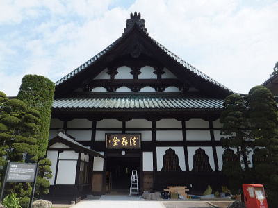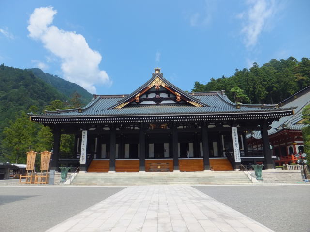 菩提梯を登った正面にあるのが本堂です。 明治8年(1875年)の大火災以来、本堂の再建は身延山の悲願でした。 昭和60年(1985年)日蓮聖人第700遺忌の主要事業として、昭和60年(1985年)に再建されたものです。 本堂は間口32m、奥行51m、総坪数970坪で、一度に2500人の法要を奉行できるとのことです。