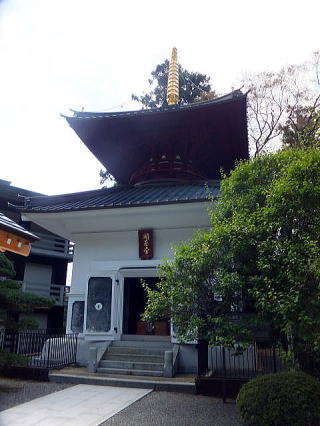 祖師堂の右手が報恩閣で、その右側にあるのが御真骨堂と拝殿です。 拝殿の奥に望む土蔵造りの八角堂が日蓮の御真骨を奉安する御真骨堂です。 御真骨堂の中央には精緻を極め善美を尽くした五重塔があり、その中央の水晶の宝龕(ほうがん)中に日蓮の御真骨が納められているとのことです。 御真骨堂は拝殿の背後にあるため、前面からは見ることができませんでした。