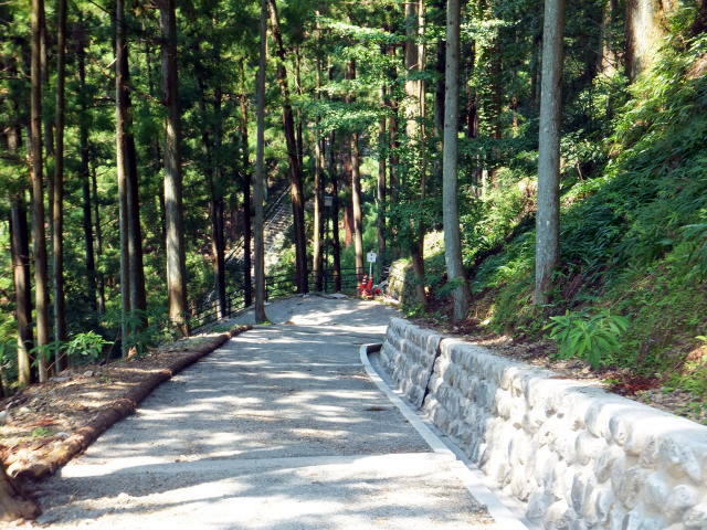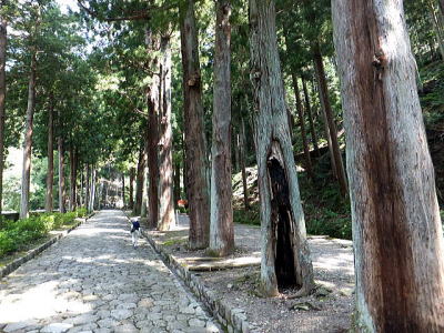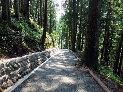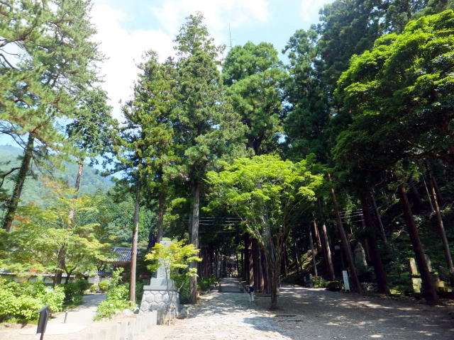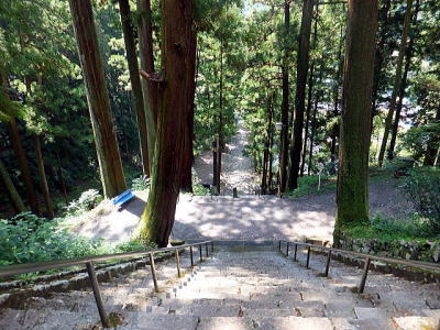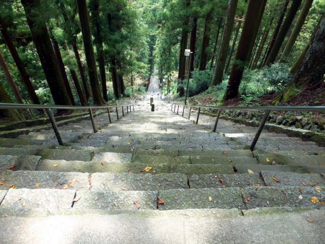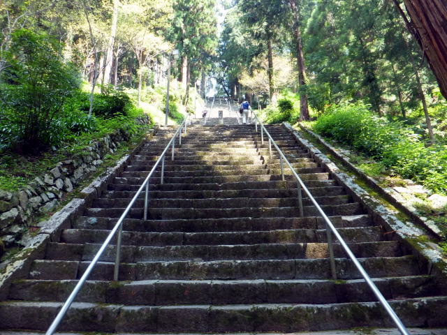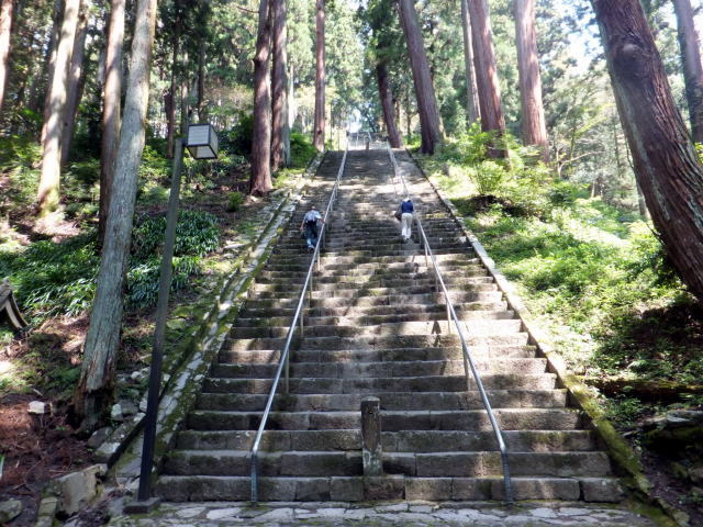 三門をくぐって杉並木を真っ直ぐ進むと菩提梯です。 菩提梯は三門と本堂を真一文字に結ぶ287段の石段からなる参道です。 高さ104m、天井に続くかのような急勾配の石段は、南無妙法蓮華経になぞらえて7区分されています。 また、両側にそびえる老杉は仏法僧の繁殖地に指定されています。
