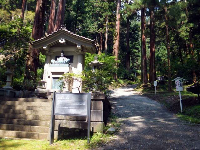 菩提梯の上り口の右側にあるのが、日蓮をこの地に招いた南部実長の銅像です。 銅像の傍らから男坂、女坂の2つの参道も境内に続いています。 菩薩梯の傍に次の掲示がありました。 「後参拝ご苦労様で御座居ます。ご年配の方、心臓の弱い方、体調の勝れぬ方は右手の女坂か男坂ご利用下さい。この菩薩梯は非常に急坂となっておりますのでご注意願います。」
