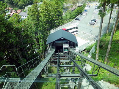 斜行エレベーター 2009年、五重塔の付帯事業の一つとして完成しました。 西谷せいしん駐車場から境内へと階段を使わずに登ることができます。