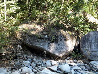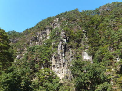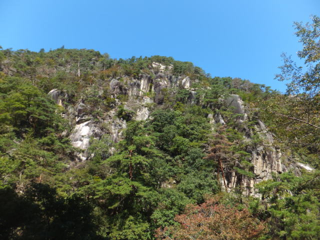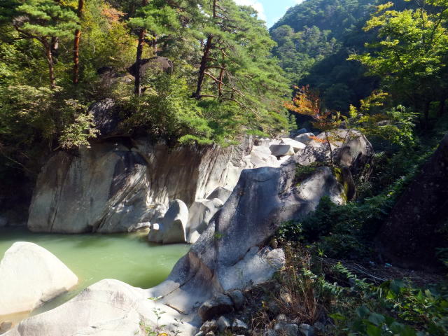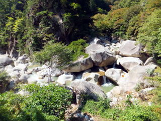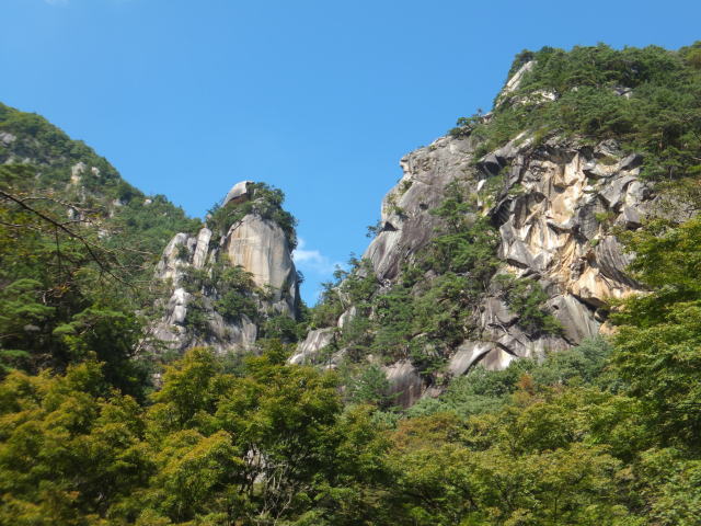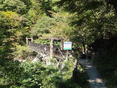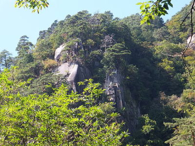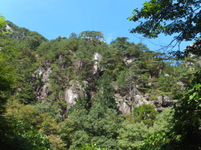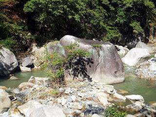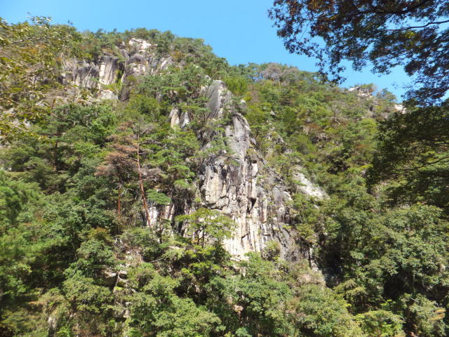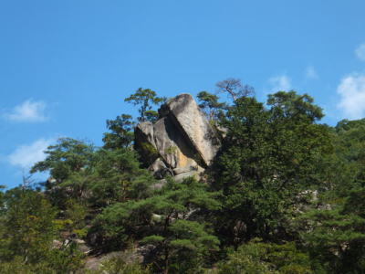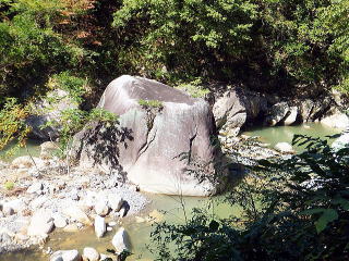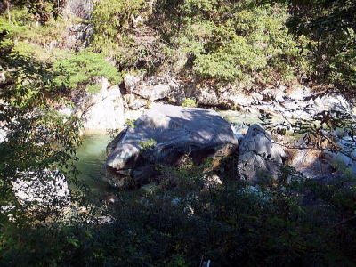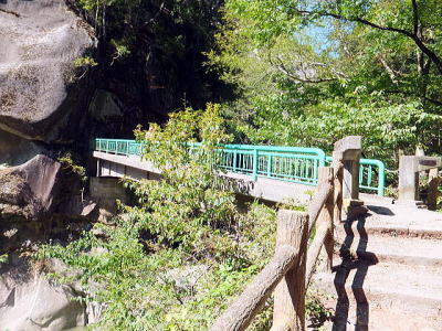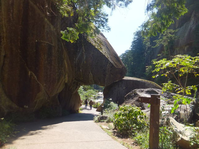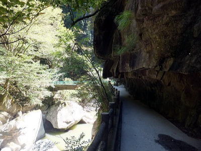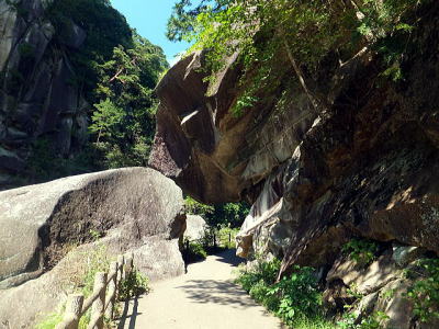 「夢の松島」から上流は歩行者専用の遊歩道になります。 夢の松島から300ほど進んだところにあるのが「石門」です。 巨大な花崗岩に囲まれた石門は先端が僅かに離れている不安定な構造となっています。
