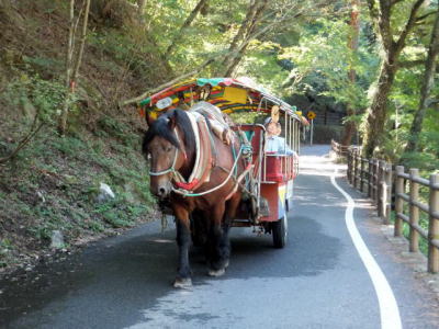 昇仙峡の天神森から能泉地区間の約2kmはトテ馬車が運行されています。 幌のかかった観光馬車で、片道所要時間は約40分です。 のんびり馬車に揺られながら、奇岩や名勝の眺めをガイド付きで楽しむことができます。
