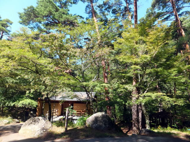 羅漢寺から散策路に戻り、上流に300mほど進んだところが能泉地区です。 三叉路があり、左方向は歩行者専用の散策路となります。 三叉路を右折して坂道を上ったところが、グリーンライン昇仙峡のバス停及び県営駐車場です。 車はここからグリーンラインを経由して昇仙峡の上側の駐車場に行くことができます。