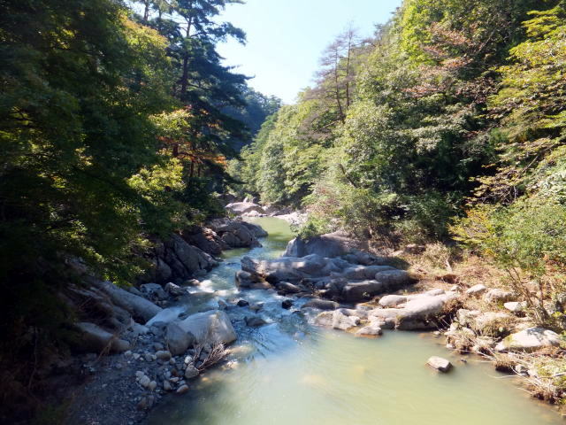 今回は、長潭橋から仙娥滝までの全長約5kmを歩いて上ることにしました。 長潭橋の天神森バス停側に渓流沿いの散策路の入り口があります。 平日でしたので車両は通行可でしたが、紅葉には少し早かったこともあり、車両の通行量は少なく、かつ散策路の勾配も比較的緩やかで、気楽に散策することができました。