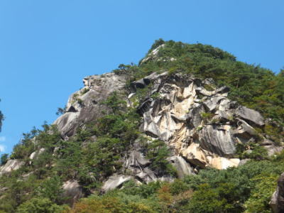 三叉路から上流が昇仙峡の渓谷のハイライトといえるエリアです。 三叉路から散策路を300mほど進んだところが「夢の松島」です。 前方に昇仙峡のシンボルである覚円峰が聳え立っています。 覚円峰は水面からほぼ垂直に屹立する高さ約180mの巨岩です。 覚円峰はその昔 覚円が畳を数畳敷ける広さの頂上で修行したと言い伝えられています。