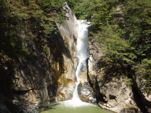 昇仙橋から200mほど進んだところが、「仙娥滝(せんがたき)」です。 仙娥滝は地殻の断層によってできた滝です。 高さ30mの壮麗な滝は、新緑から紅葉、雪景色と四季それぞれに美しさを見せてくれます。 日本の滝百選に選ばれています。