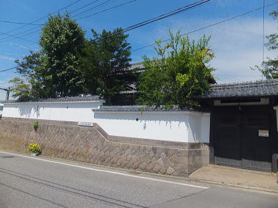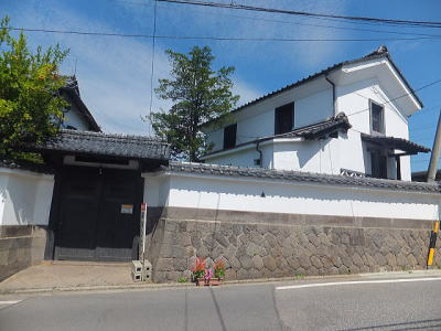 「粂屋/旧脇本陣」から100mほど進んだ上り坂のカーブの途中に、石垣に囲まれた白い蔵のある家があり、石垣に「大井伊賀守居城鍋蓋城址」の看板があります。 この一画は、戦国時代に最初に作られた鍋蓋城の跡です。 江戸時代は家老の屋敷で、両脇には町人地との境の木戸があったとのことですが、その面影は残っていません。 街道を少し曲げて、城に入りにくくした構造は城下町ならではです。