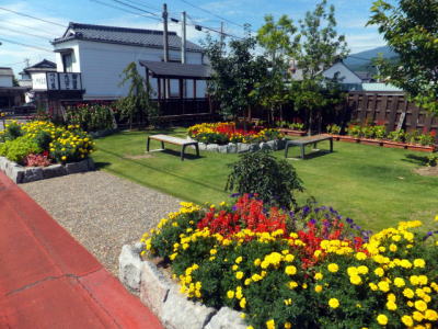 「旧角の大塚」の北国街道の反対側に「ほんまち遊子公園」があり、可愛い花が咲き誇っていました。 また、公園の傍には「ご馳走屋 火付け盗賊」「夢番地」など食事のできるお店があります。 「ご馳走屋 火付盗賊」は江戸後期の建物です。