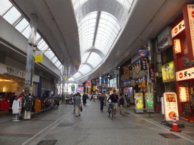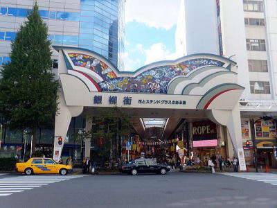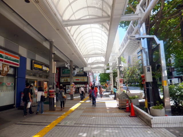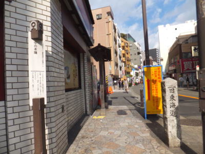 川崎市観光案内所で受付を済ませた後、川崎アゼリア地下街を移動して出口39から地上に出ると市役所通りです。 銀座街、銀柳街を左右に見て、そのまま真っ直ぐ100m程進むと「砂子」の信号で、その先左手に三井住友銀行があります。 信号を渡らずに左折すると「旧東海道」で、川崎宿のあった場所です。