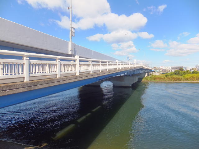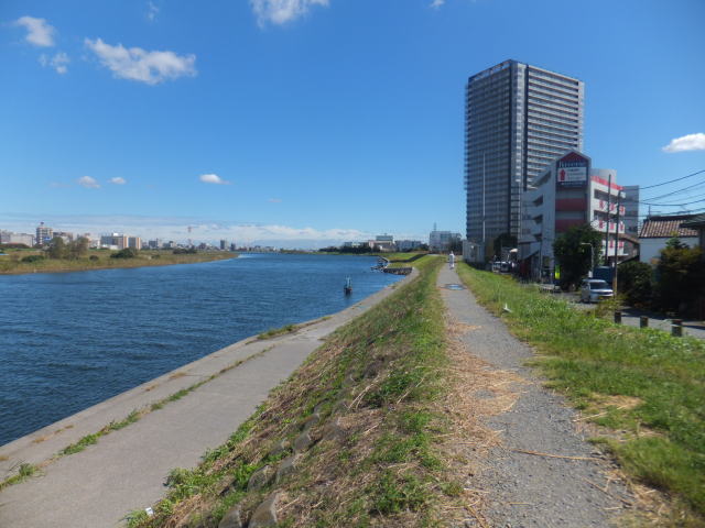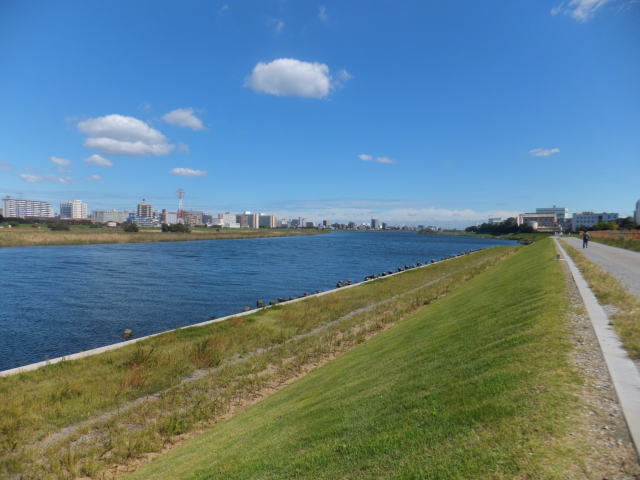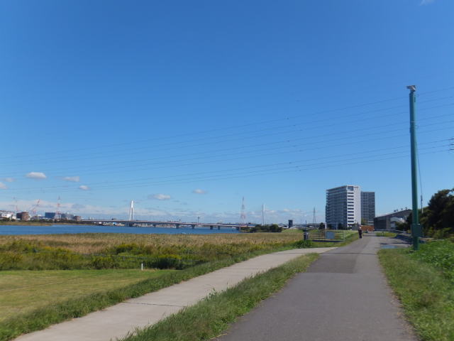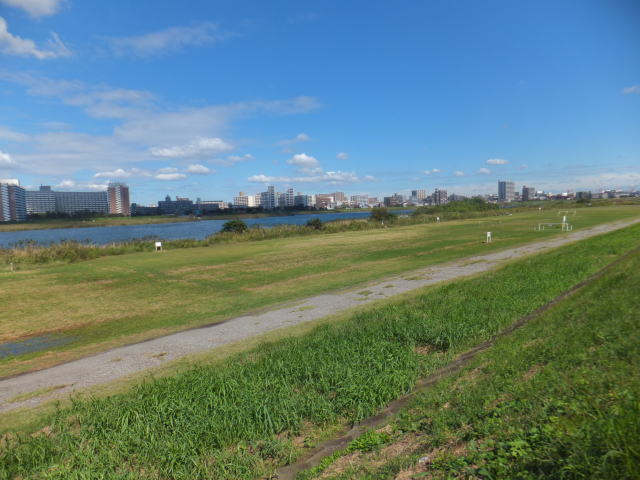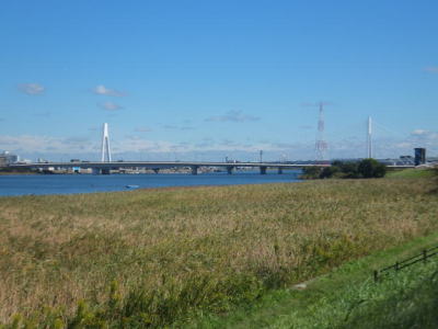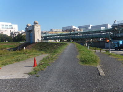 多摩川の光景 緑色の鉄柱の先のスロープを下がります