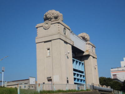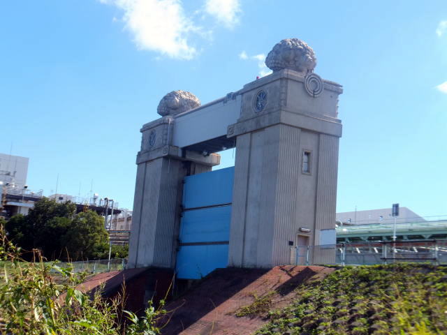 「川崎河港水門」は完成したものの、社会情勢の変化により運河建設計画は中止され、水門から約220m掘られていた運河は埋め立てられ、水門近くの約80mが船溜まりとして残るのみとなっています。 水門は、砂利の陸揚げ施設として、砂利運搬船等の出入りに現在も利用されています。 水門の上部には川崎市の市章と、往時の川崎の名産物であった梨、葡萄、桃などをモチーフした装飾があります。