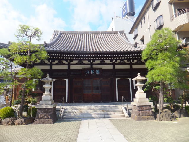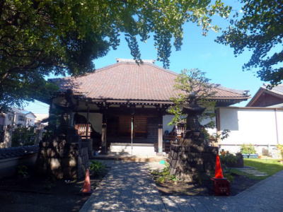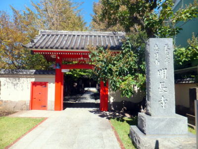 踏切を渡って狭い路地をさらに300m程進むと丁字路になります。 丁字路の左右が「大師表参道商店街」で、丁字路の左側にあるのが「明長寺」です。 明長寺の創建は文明年間(1469年〜1487年)と伝えられていますが、寛文9年(1669年)の落雷により堂宇が焼失した後、天明2年(1782年)に現在の本堂が再建されました。 明長寺には、国の重要文化財に指定されている葵梶葉文染分辻が花染小袖(あおいかじはもんそめわけつじがはなぞめこそで)が所蔵されています。