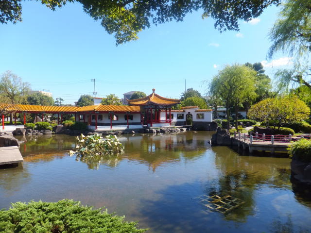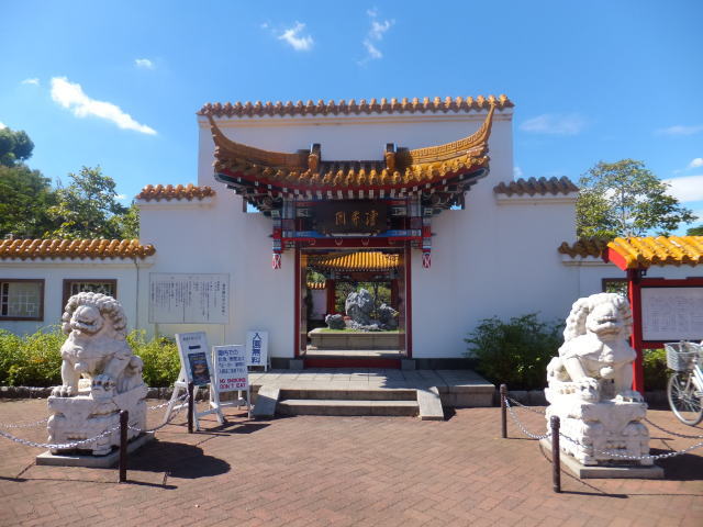 丁字路を左折し、最初の信号を右折して50m進んだ右手が「大師仲見世通り商店街」入口です。 「大師仲見世通り商店街」に入らずにそのまま200m程直進したところが「大師公園」です。 「大師公園」の一角に「瀋秀園(しんしゅうえん)」があります。