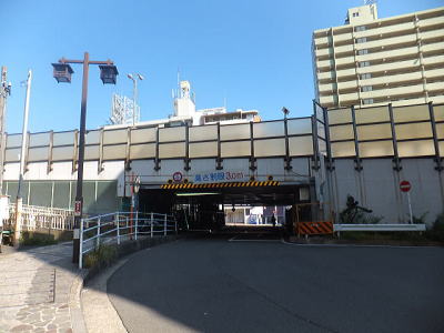 「川崎河港水門」から多摩川土手の遊歩道を道なりに1.5Kmほど進むと右手に緑色の鉄柱があり、右下に下りることのできるスロープがあります。 スロープを下りて右折し300m程進むと「中瀬3丁目」の信号です。 「中瀬3丁目」の信号を渡り、狭い路地を50mほど進むと京急大師線の踏切があります。 踏切の左方200mに京急大師線の「東門前駅」があります。