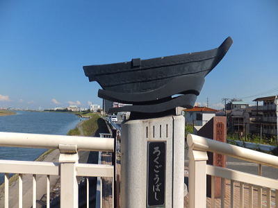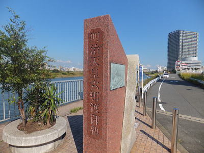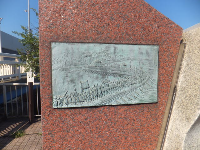 現在は、六郷橋が架けられており、その上を走っているのが「第一京浜(国道15号)」です。 六郷橋の川崎側に渡船跡の碑と、明治天皇六郷渡御碑が建ち、欄干に渡船のモニュメントがあります。 明治天皇六郷渡御碑に「武州六郷舩渡図」と題されたレリーフがはめ込まれており、多摩川に舟を並べて橋のようにした上を行列が渡っている様子が描かれています。