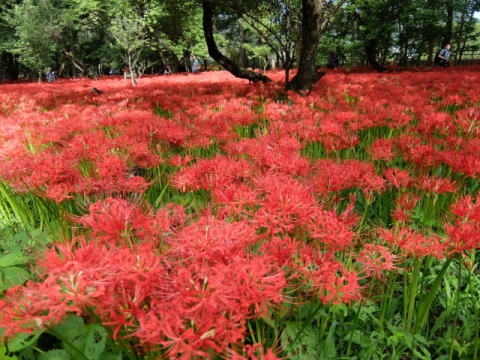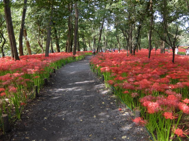 秋の彼岸の頃には一面赤い絨毯を敷き詰めたかのような見事な光景になり、毎年30万人を超す観光客が、その美しさに惹かれて訪れています。 今年は天皇・皇后両陛下も9月20日(水)にお訪ねになりました。 訪れた観光客に巾着田及び市内プチ観光を楽しんでもらうために、郷土物産品の推奨と郷土芸能の披露を行う「巾着田曼珠沙華まつり」が開催されます。 今年も巾着田では、9月16日(土)〜10月1日(日)の16日間、午前9時から午後5時の間、曼珠沙華まつりが開催されました。