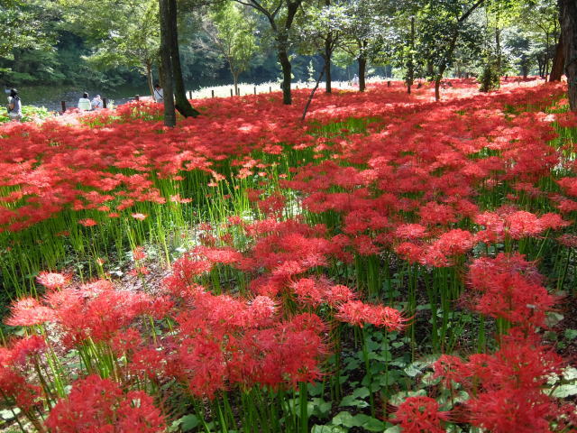巾着田周辺の高麗川の岸辺は、彼岸花(曼珠沙華)の群生地で、その規模は幅約50メートル、長さ約600メートルにわたっており、全国的にも最大級のものといわれています。 どうしてこの地域に群生するようになったのかについては、定説はないようですが、曼珠沙華は種ではなく球根で増えるものであることから、川の増水などで流れてきた漂流物の中に、曼珠沙華の球根が混じってきたのが、群生の始まりではないかといわれています。