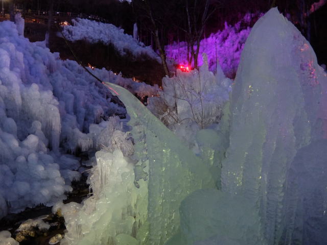 毎週金・土・日曜日にライトアップ(日没〜午後8時まで)が行われます。 夜に見ると幻想的で、魅力倍増という感じです。 あしがくぼ氷柱では、昼間は地元のボランティアの皆さんが心を込めて作る甘酒または地元産の紅茶を1杯無料で提供されています。氷柱に囲まれて飲む甘酒は美味しいです。 今回は昼間とライトアップのいずれも見ることができました。